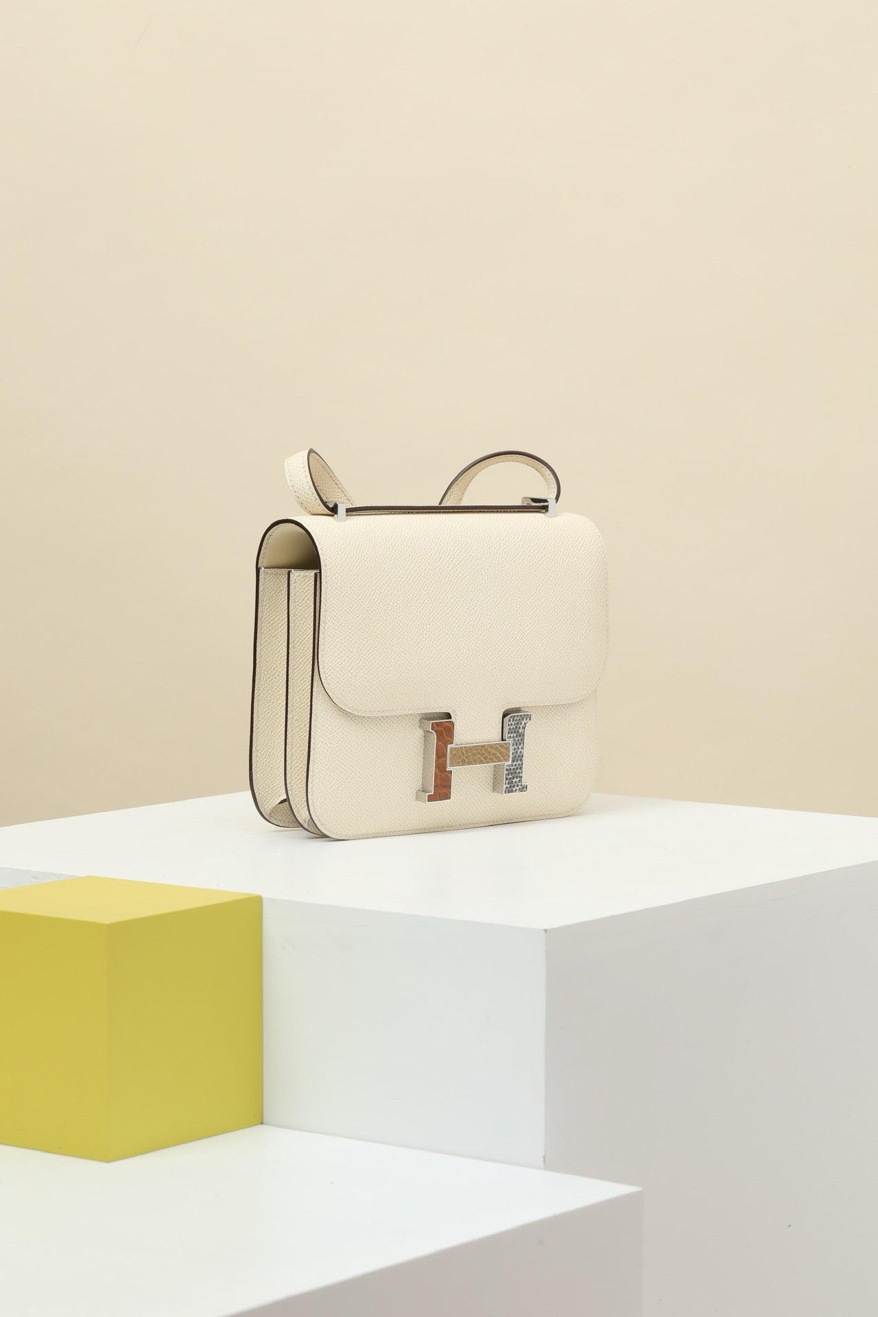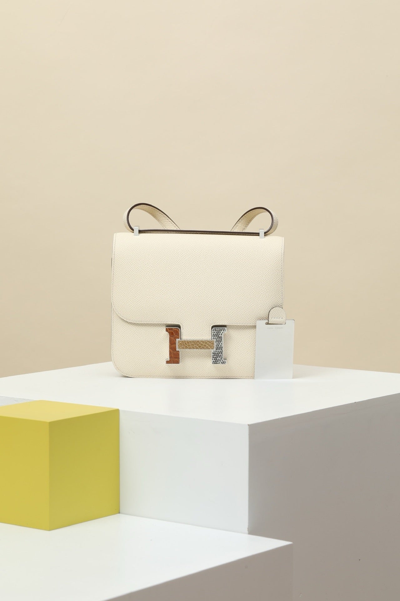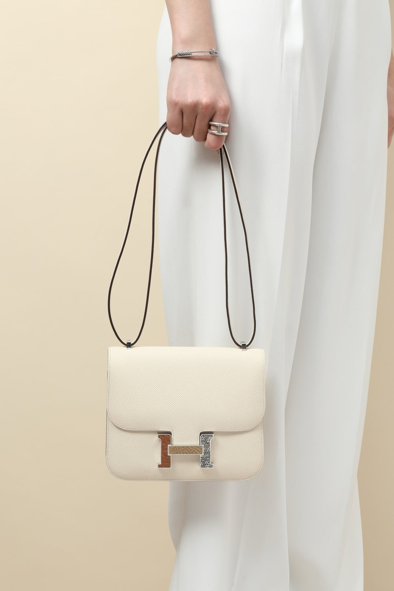 CJG19 , I2 Cream White / Tricolor Clasp, EP leather with shiny American alligator and lizard clasp (square clasp) #4389